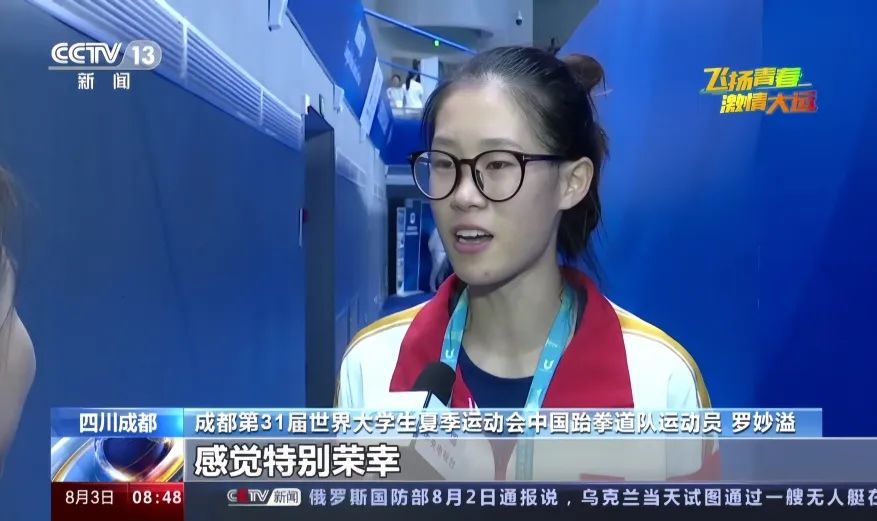 8月3日,央视《新闻联播》、央视新闻频道《朝闻天下》栏目报道了本届世界大学生运动会跆拳道女子-49公斤级比赛铜牌获得者,我校学子罗妙溢:在赛场上收获友谊,成就梦想。