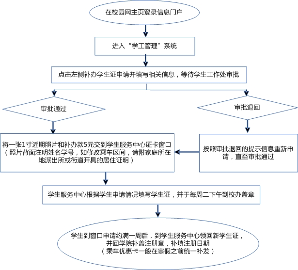 (5)乘车优惠卡每学期期末进行集中补办。因损坏或学生证丢失换、补乘车优惠卡者,请携带乘车优惠卡工本费7元,在每周工作日内上午10:00-下午6:00到学生服务中心(体育馆一层)2号窗口办理。