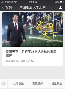 “中国地质大学北京”官方微信由党委宣传部负责内容更新,官微现设“一周要闻”、“解锁地大”、“二十四节气”、“见字如面”等栏目,并开通了北地在线、资讯服务、招生就业等版块,为订阅者提供信息服务。随着新媒体的迅猛发展,我校官方微信已成为推动校园新闻宣传改革与转型的有力引擎,为活跃校园文化生活、提升学校品牌形象起到了积极作用。