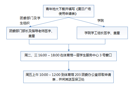 为规范我校各学院及学生组织(如学生会、社团联合会、青年志愿者协会、大学生艺术团等)申请活动场地的申请流程,确保学校正常的学习生活秩序,我校对于活动场地的使用做出了一系列的规定。如果学生组织或社团需要使用学校的场地来进行活动,根据活动的性质要先取得相关部门的审批,审批通过的才能继续进行。