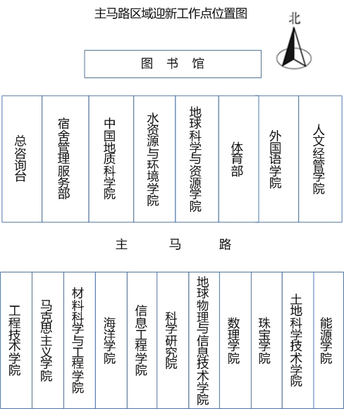 为了让新生更好地找到迎新工作点,流程图下方有学校平面图与各迎新点位置图,可以结合流程图查看。