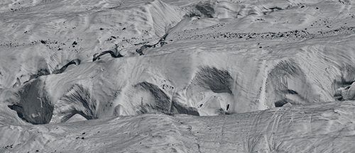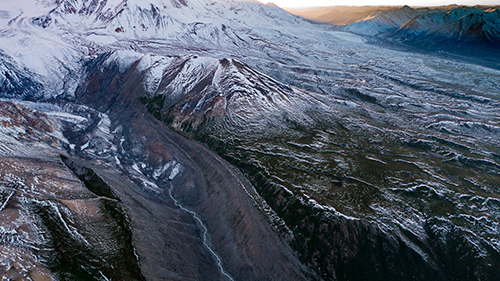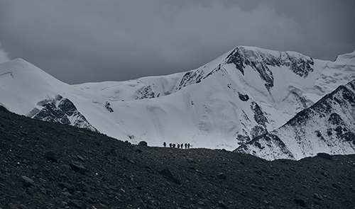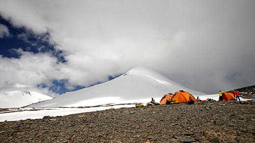 18日上午,登山队开始进山,徒步约5公里后到达大本营。从清晰的石头路,走过高山草甸,再到冰川河流,一路爬升,一路观察。岩浆岩中的矿物、河流中的冰碛物都成了我们的重点拍摄对象。在大本营扎好帐篷后,队员们便带着地质锤、罗盘、放大镜和野簿向冰川行进了,空气里的氧含量变得稀少,强烈的紫外线灼烧着队员的脸庞,但这都不能阻止登山队员向上攀登的决心。